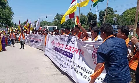 Jagiroad: The All Tiwa Students' Union (ATSU), All Tiwa Women Association (ATWA), in association with many organizations, on Friday staged a one-hour National Highway blockade to protest against the State Government's proposal to expand the capital area upto Jagiroad paper mill. The protesters with placards in their hands, demanded Sixth Schedule status and constitutional safeguard for the indigenous people. ATSU advisor Rimal Amshi and secretary Dipon Amsong took part in the protest.