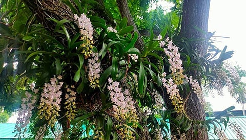 Several species of orchids found across the Northeastern region have been planted and preserved under the supervision of the Dhanesh Eco Club. With the arrival of spring, different types of kopou phool (fox-tail orchids, Rhynchostylis retusa) are seen blooming beautifully around the school premises.