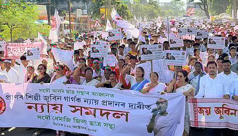 Slogans such as ‘Justice for Zubeen Garg,’ ‘No politics in Zubeen’s name,’ and ‘Go back BJP government’ reverberated across the streets, as around a thousand people, including students, locals, and civic leaders, joined the rally.