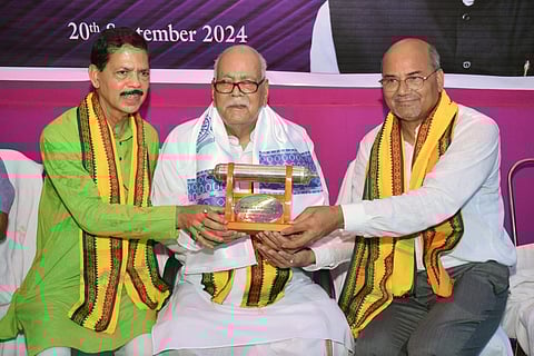 Silchar: The Assam University on Friday conferred ‘honoris causa’ to the former Union Minister Kabindra Purkayastha at a function held at the latter’s residence at Nutan Patty, Silchar. Purkayastha, 94, was unwell for last few months and hence could not attend the AU Convocation on September 13 where noted litterateur Diganta Biswa Sarma was conferred upon with the prestigious honorary Ph.D. Former Asom Sahitya Sabha president Rongbong Terong, the other recipient of the honoris causa this year too came to the AUS campus and the degree was later handed over to him.