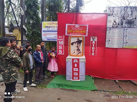 LAKHIMPUR: On the occasion of the ‘Atmabalidan Divas’, martyr Bhagat Singh was commemorated in Lakhimpur district with due reverence on Thursday. In this connection, the Lakhimpur district committee of All India Democratic Students’ Organisation (AIDSO) organized a Shradhanjali programme in North Lakhimpur town near Deputy Commissioner’s Office. An exhibition over the quotes and rare photographs of Bhagat Singh was organized on the occasion. It was followed by a rally with tableau which was taken out from North Lakhimpur town to Dhakuakhana town covering a distance of 80 kilometers. After the arrival of the rally in Dhakuakhana, a street meeting was held at Gandhi Park, wherein Anupam Chutia, the secretary of the Lakhimpur district unit of the Socialist Unity Centre of India (Communist), delivered lecture on life and works of Bhagat Singh, who is referred to as the Shaheed-e-Azam (The Great Martyr).