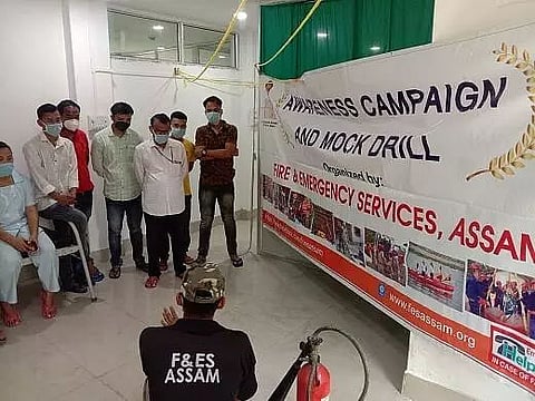 The Fire Brigade personnel gave demonstrations about how to use the fire safety equipment in emergency situations and how to protect people during disasters like earthquakes. The programmes were held at Shree Moyee Nursing Home, Dhekiajuli, CHC and PHC, Dhekiajuli, and at Sirajuli Model Hospital.