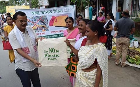 Dibrugarh: Taking the fight against the use of single-use plastic forward, the Dibrugarh District Drinking Water and Sanitation Committee generated awareness among people in various market areas of the town on Saturday, and also distributed cloth bags among the public as an alternative to plastic bags.