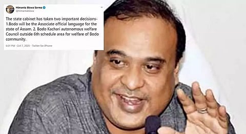 Assam's Finance, Health, and Education Minister Himanta Biswa Sarma, who has recently promised that all the clauses in the BTR treaty shall be enacted even as the BTAD districts (Chirang, Kokrajhar, Udalguri, and Baksa) gear up for polls, confirmed the development via an evening tweet. "The state cabinet has taken two important decisions- 1.Bodo will be the Associate official language for the state of Assam. 2. Bodo Kachari autonomous welfare Council outside 6th schedule area for welfare of Bodo community," the Minister wrote in a tweet.