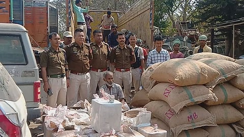 BOKAJAN: In its continued drive against smuggled goods, police in Karbi Anglong seized 40.32 quintals of Burmese areca nuts and 320 kg of dry poppy at National Highway (NH) 39 in Khatkhati near SBI branch in the wee hours of Tuesday. The consignment of dry areca nuts was kept in 30 jute sacks and 25 cartons while the consignment of dry poppy was kept concealed in 16 cartons covered by 318 bags of ginger in the vehicle.
