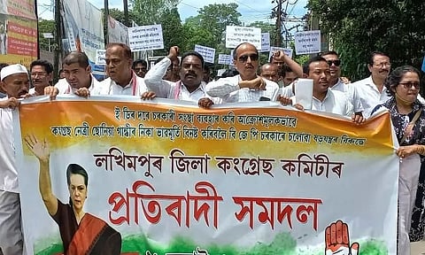 In this regard, more than 300 members and activists of the LDCC, district unit of Youth Congress, Mahila Congress, NSUI Sewa Dal, led by LDCC president Gagan Chandra Borah, general secretary (administrative) Gangajyoti Tayegam, took out a protest rally in North Lakhimpur township. During the course of the rally, the protesters shouted slogans to stop intervention over the freedom and impartiality of Enforcement Directorate and to stop harassment over Sonia Gandhi and Rahul Gandhi.