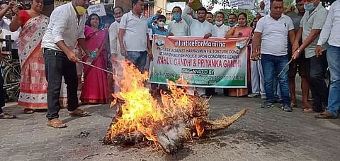 Demanding justice for the rape victim and protesting against this alleged 'inhuman' harassment on Rahul Gandhi, the Congress activists, including the members of the brother and sister organizations, burnt the effigies of Prime Minister Narendra Modi and Uttar Pradesh Chief Minister Yogi Aditya Nath in North Lakhimpur town. The protesters rocked the environment by shouting various slogans to flay the Prime Minister and the UP Chief Minister.