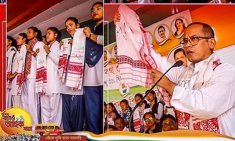 Congress leader Rahul Gandhi who was recently in the state said that Congress would not allow the implementation of the controversial law, if elected to power. He also sported a gamosa, with the letters CAA crossed out.