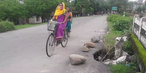 TANGLA: The road bridge over River Nonai, connecting Tangla town with Kukurakata and its neighbouring villages has become a trap, lying unattended for months now, causing distress to the commuters. A corner of the concrete bridge has collapsed creating a massive hole that is deemed to be a veritable death trap. While the authorities have temporarily put sandbags over it, locals, however, have expressed concern urging for a permanent concrete fixture.