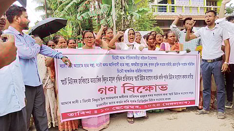 DEMOW: A protest programme against smart meters and excessive electricity bills through them was held on Tuesday in front of the gate of the Demow Electrical Sub-Division Office APDCL, with the support of the people of Demow and the surrounding areas and in association with ATASU, AASAA, AYM, KMSS, CMSS, and Demow Regional Committees. The protesters shouted slogans against the Power Department and said the loot in the name of smart meters should be stopped. They demanded to cut smart meter connection and provide the old meter connection. On Tuesday, there was heavy police presence in front of the Demow Electrical Sub-Division Office APDCL gate during the demonstration. Higher-ranking officials of the Demow Electrical Sub-Division Office APDCL and the Demow Circle Officer visited the demonstration site in front of the office's gate and heard about the issues people were having with smart meters.