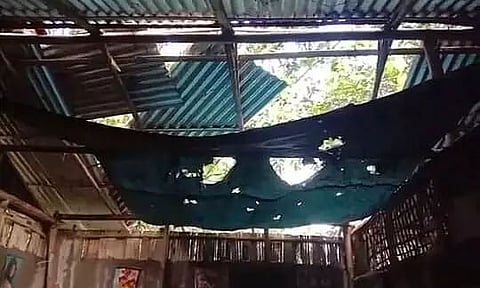 This story is about a farmer from Teok in Assam. The tin roof of his house has big gaping holes, portions of the tin roof were blown away. The house made of thatch and bamboo is barely holding together.