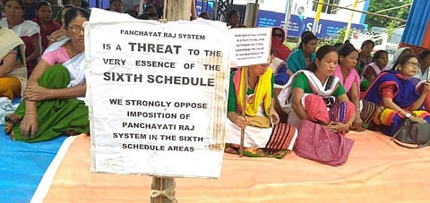 Haflong: In protest against the implementation of Panchayati Raj system in 6th Schedule areas and setting up of detention camp in Dima Hasao, the Dimasa Women’s Society on Tuesday staged dharna in front the office of the Dima Hasao Deputy Commissioner with the support of the All Dimasa Students’ Union and Dimasa Students’ Union.