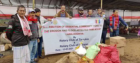 TINSUKIA: Rotary Club of Duliajan and Rotary Club of Tinsukia distributed relief materials on Tuesday to the inmates of Laika- Dodhia who established temporary makeshift camp at Lezaiholla demanding relocation and rehabilitation since the past 25 days.