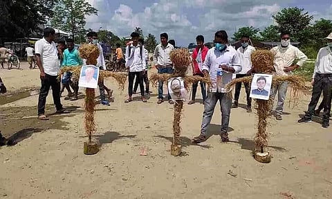 DEMOW: The All Adivasi Students' Association of Assam (AASAA) Demow Regional Committee burnt the effigies of Tezpur MP Pallab Lochan Das, Jorhat MP Kamakhya Prasad Tasa and Minister of State for Labour Welfare, Sanjay Kishan in Rajmai near Demow on Tuesday. The activists demanded hike in daily wages of tea garden labourers to Rs 350, providing ST status and land pattas to the Adivasis.