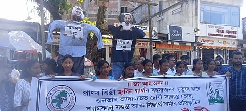 BOKAKHAT: The Asom Jatiyatabadi Yuba Chatra Parishad (AJYCP) staged a mock execution of Shyamkanu Mahanta and Siddharth Sharma, accused as responsible for Zubeen Garg’s death. The Bokakhat district committee of the organization held a protest programme on Thursday in the heart of Bokakhat town. On National Highway 37 at Bokakhat, the protesters symbolically hanged the effigies of Mahanta and Sharma as part of their demonstration.