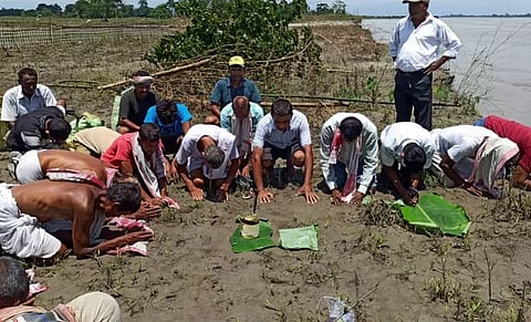 Under such circumstances, the people of Amguri, including the homeless people of Ghancharai, Jugalpur and Chandrapur, led by Arunoday Yuva Sangha, were compelled to launch erosion-prevention measures in the affected area on Saturday on their own. In order to check the ongoing erosion, they attempted to install bamboo spars with the help of monetary and material contribution of the local public.