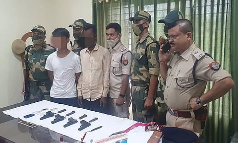 The two arrested persons were identified as Nurul Islam (31) and H. Liam Khiyam (22). Nurul is a resident of Lamargram, Patharkandi in Karimganj, while Khiyam hails from Tuensang, Nagaland. Of the five pistols, one was found to be a pen gun.