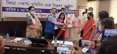 AMINGAON: A total of 80 beneficiaries of the district were handed over cheques under 'Chief Minister's COVID-19 Widows Support Scheme' at a function held in the Office Conference Hall of the Deputy Commissioner of Kamrup district. The cheques of Rs. 2.5 lakh each were handed over by Chandra Mohan Patowary, the Guardian Minister of the District and Minister of Industries and Commerce, Transport, etc.