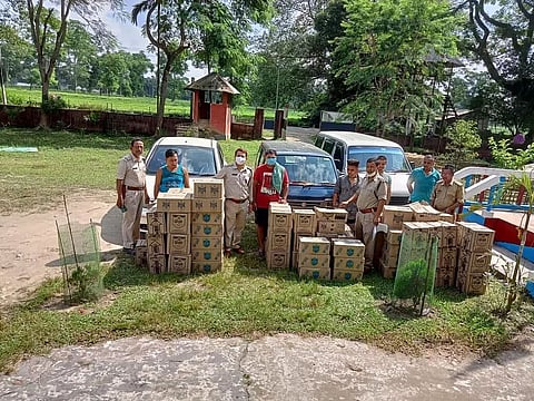 TINSUKIA: Acting on a tip-off, a team of Margherita police led by SDPO Partha Protim Das and assisted by personnel from Pengeree Police Station, intercepted three vehicles that were coming from Bordumsa, Arunachal Pradesh at Pengeree-Bordumsa Road near Burhi Dihing Reserve Forest in the wee hours of Friday and recovered huge cache of IMFL.