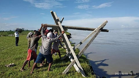 LAKHIMPUR: Since April, massive erosion caused by the mighty Brahmaputra has posed alarming threat to the Sissi-Tekeliputa embankment, which secures the life and properties of over five lakh people living in Dhakuakhana and largest river island Majuli. At present too, erosion of the mighty river has affected the down part of the Bandena check bundh to the east of Matmora area. On the other hand, erosion still continues in the Madarguri area to the west of Matmora.