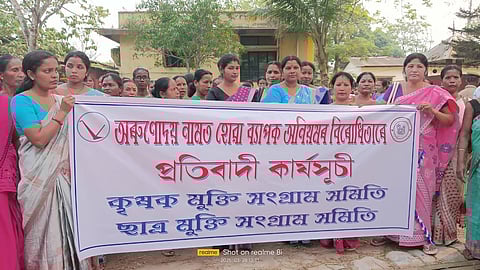 GAURISAGAR: The Krishak Mukti Sangram Samiti (KMSS) and its sister organization Chatra Mukti Sangram Samiti today staged a protest programme in front of Gaurisagar Development Block in Sivasagar District today, accusing irregularities in the Orunodoi 3.0 scheme.