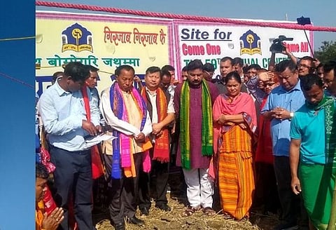 MANGALDAI: The large paddy field at village Majar Chuba near the historic Tamreswar Mandir at Khairabari in Udalguri district on Wednesday wore a festive look with attendance of more than 2,000 villagers, including office-bearers of Bodo Sahitya Sabha (BSS), office bearers of the reception committee of the 59th session of BSS and various organizations to witness the most auspicious moment of the laying of the lai khuta of the pandal of the annual session of BSS scheduled on January 20, January 21 and January 22.