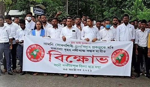 LAKHIMPUR: The AASU (All Assam Students' Union) has resorted to stir demanding the closure of all mega river dam projects including the controversial Subansiri Lower Hydroelectric Project (SLHP), being constructed by NHPC Limited at Gerukamukh in Assam-Arunachal Pradesh border area. In this context, the Lakhimpur district unit of the organization protested on Monday by initiating a protest programme to reiterate its demand to close the construction of the SLHP.