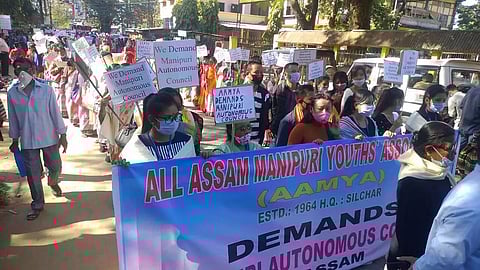 Silchar: All Assam Manipuri Youth Association (AAMYA) in continuation of its long pending demand for an autonomous council for the politically, socially and economically deprived six lakh Manipuris of the State, brought out an impressive rally which after parading through the main thoroughfares of the town staged protest demonstration in front of the district administrative head 24 hours ahead of the two day visit of Chief Minister Sarbananda Sonowal. They pressed for the fulfilment of their demand. A memorandum to the effect was addressed to the Chief Minister, drawing his attention to the reasons behind it.