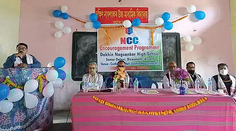 JAMUGURIHAT: To encourage the students to join in the nation-building process and to motivate them towards joining the National Cadet Corps (NCC), a special programme was organized at Dakhin Nagsankar High School on Saturday. The day-long programme began with the hoisting of the flag by Anjan Baskota, CTO (Caretaker Officer), Dakhin Nagsankar HS followed by a march past by the cadets. Before the open session, one minute silence was observed in the memory of CDS Bipin Rawat and others who had lost their lives in the recent helicopter crash and in memory of Bhaben Bora, an eminent artiste and educationist of Jamugurihat area. The main session was held with Ballav Chapagain, the headmaster of the school in the chair that began with the offering of floral tributes and lighting of earthen lamp in front of the portrait of CDS Bipin Rawat by Dr. Chintamani Sarma, principal of Biswanath College who graced the programme as a chief guest.