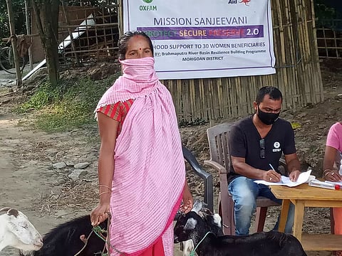 Oxfam India distributed cattle, handloom materials and grocery items at Jamadari, Bangalpara and Mikirbheta to poor and needy people. The organization provided livelihood support by distributing weaving materials to 30 women beneficiaries under Mission Sanjeevani ( Protect, Secure, Preserve 2.0) at Buwalguri-Kacharigaon (an erosion-affected area) under Laharighat block and Batabari under Bhurbandha block. The organization provided 13 handloom items to 13 women in these areas. Besides, the organization provided grocery items to two persons and 13 cows and 12 goats to poor and needy people at Bangalpara and Mikirbheta.