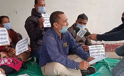DEMOW: Under the banner of All Assam Panchayat and Rural Development Contractual Employees Council, the contractual employees of Panchayat and Rural Development under Demow Development Block staged a sit-in at Demow Block Development Officer Office on Tuesday in protest against their various demands. The employees lit earthen lamps in front of the photo of Mahatma Gandhi and started their protest programme in Demow Block Development Officer Office. They appealed the Chief Minister to look into their problems.