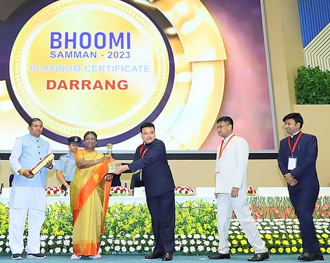 MANGALDAI: Darrang district has become the only district of Assam to be conferred with the newly-introduced prestigious national award ‘Bhoomi Sanman’ 2023 by President Draupadi Murmu in an august function at Vigyan Bhavan, New Delhi on Tuesday morning. In the function, nine states and 68 districts of the country have been conferred with this award.