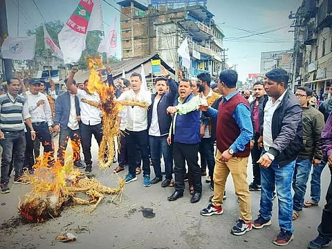 Strongly opposing the declaration made by the minister concerned, the All Assam Students' Union (AASU) and Asom Jatiyatabadi Yuva Parishad (AJYCP) jointly took to the street in Lakhimpur with massive protest programme. In this context, the activists of the both organization burnt the effigies of Prime Minister Narendra Modi, Union Minister for Power RK Singh and Assam Chief Minister Dr. Himanta Biswa Sarma. The activists of the both organization demonstrated the protest programme at Main Chariali of North Lakhimpur town.