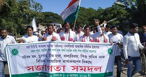 Tamulpur: A mass rally was taken out in Darrangamela along the Indo-Bhutan border against drugs, illegal liquor, teer gambling, child marriage and anti-social activities. It was organized by the All BTAD Minority Students’ Union (ABMSU) Kumarikata Anchalik Committee, in association with Darrangamela Primary Committee and Garaje Line Primary Committee, under Tamulpur subdivision in the district of Baksa.