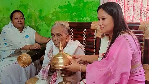 TINSUKIA: To commemorate Quit India Movement, the Tinsukia district administration felicitated freedom fighters along with their families at their respective houses on Tuesday. A centenarian freedom fighter from Phillobari, Satyalata Gogoi was felicitated by Suranjita Sarma, Circle Officer (Attached) Doomdooma.