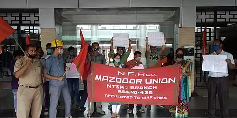 Demanding immediate release of bonus on the eve of Durga Puja, the 52 branches of NFRMU, including Tinsukia, New Tinsukia, Ledu, Dibrugarh workshop, Simulguri, Mariani and Furkating of Tinsukia division staged protest in front of their respective premises maintaining COVID-19 protocol on Tuesday. Gogoi said that their agitation would continue till the government conceded to their demands.