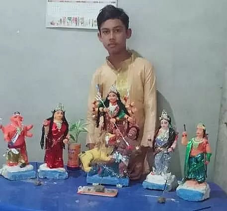 Jamugurihat: Gourav Puran, a student of Class VII of Nagsankar High School, has made clay idols on the auspicious occasion of Durga Puja. Gourav is the son of Mintu Puran, a resident of Orang Basti of Nagsankar under Sootea police station. Gourav had a keen interest in making idols and other sculptures since childhood. This time, he has made out idols of Goddess Durga, Goddess Saraswati, Goddess Lakshmi, Lord Ganesha and Kartika.