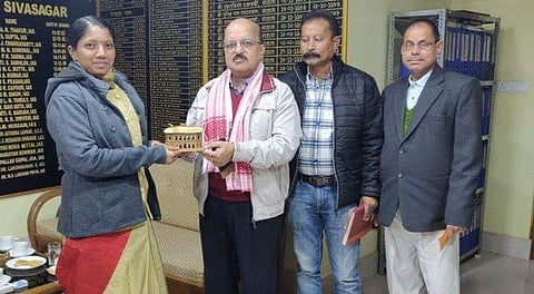 SIVASAGAR: The member secretary of Central Silk Board, Rajit Ranjan Okhandiar, a 1987-batch IFS officer, visited Sivasagar on Monday. Deputy Commissioner Dr. MS Lakshmi Priya extended a warm welcome to Okhandiar at her office chamber. She welcomed him with the traditional gamosa and presented him with a bamboo-made replica of the historical Rang Ghar. While presenting the memento, she briefed Okhandiar on the glorious Ahom era and also about the historical significance of Sivasagar.