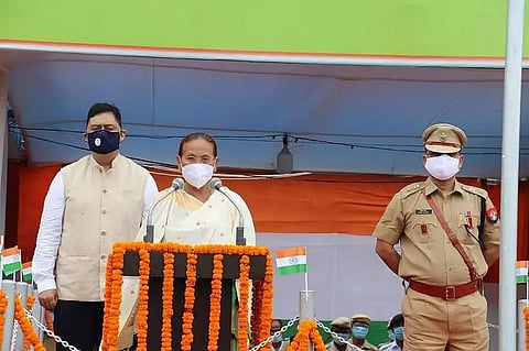 The Minister of Social Welfare and Soil Conservation Pramila Rani Brahma hoisted the National flag at Kokrajhar in a thin public attendance. She inspected the guard of honour by armed contingents before hoisting of flag.