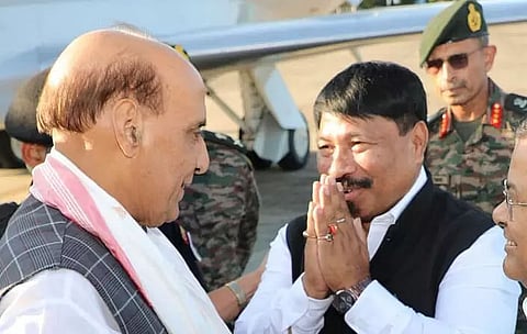 DIBRUGARH: Union Defence Minister Rajnath Singh visited Army Formation in Dinjan in Dibrugarh on Wednesday. Singh is on a two-day day visit to frontline locations in Eastern Arunachal Pradesh from September 28 to September 29. Singh was accompanied by Army Chief, General Manoj Pandey and Lieutenant General R P Kalita, Army Commander Eastern Command along with other senior officers.