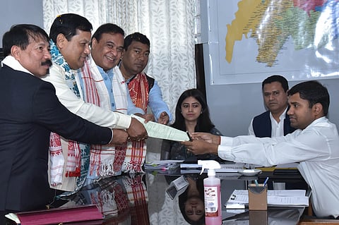 DIBRUGARH: Union Minister and senior BJP leader Sarbananda Sonowal filed his nomination for the Dibrugarh Lok Sabha constituency on Tuesday. Sonowal who was accompanied by Chief Minister Himanta Biswa Sarma, Union Minister of State for Petroleum and Natural Gas Rameswar Teli and Asom Gana Parishad (AGP) president Atul Bora filed his nomination before Returning Officer Bikram Kairi.