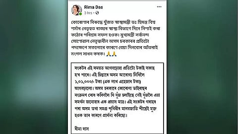 Guwahati : In a benevolence, celebrated filmmaker and pride of Assam, Rima Das has donated Rs. 1, 0,1000 towards the Assam Arogya Nidhi, opened by the state government to help the poor and economically unsound people during the ongoing nationwide lockdown, which ends on April 14, 2020. Revealing this, Das has said in a Facebook update that she donated the money to help the government to mitigate the economic crisis created by the novel coronavirus pandemic. "Health Minister Himanta Biswa Sarma has been relentlessly trying hard to mitigate the unprecedented crisis. I am wishing success to the Government of Assam, which under the leadership of Chief Minister Sarbananda Sonowal has been trying hard to tackle the crisis. I have donated Rs. 1 lakh and 1 thousand to the Arjgya Nidhi", Das said in the post. Her "Village Rocksters" was Indian nomination for the Oscar in 2018. Earlier on today, Health Minister Himanta Biswa Sarma appealed the state government employees to take care of at least five families each during the lockdown. It has been reported that the lockdown, imposed by the Union government to check the spread of novel coronavirus has hit hard the poor including daily wage-earners. Meanwhile, the coronavirus positive cases in the country spiked to more than three thousand and more than 70 people lost their lives in the battle against the pandemic. In Assam, 25 people have tested COVID-19 positive, so far.