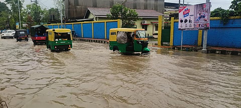 A heavy spell of rain started from Wednesday night and on Thursday morning, the roads of Dibrugarh were waterlogged. The busy Mancotta road was also badly affected by the flash flood at several stretches. The 300-metre stretch of road, near the newly-constructed flyover, from the Chowkidinghee side, resembled a rivulet with the water level reaching up to the knee-height.