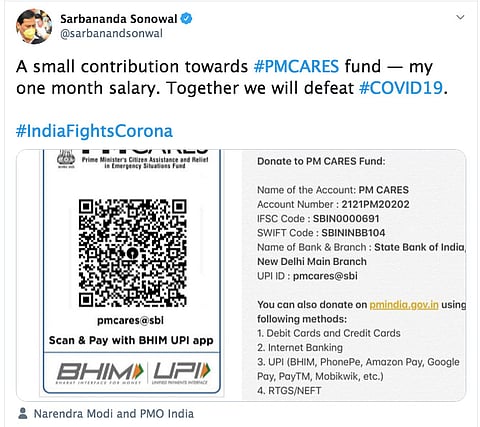 GUWAHATI: Chief Minister of Assam Sarbananda Sonowal has donated one month’s salary towards PMCARES fund.