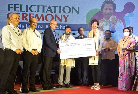 Today's felicitation function was attended by Union Minister of State for Petroleum etc Rameshwar Teli as the chief guest and several key officials from both the oil companies including SK Barua (Managing Director, NRL) and Harish Madhav (Director, Finance, OIL). Lovlina received cash reward of Rs 25 lakh each (after deducting tax) from OIL and NRL.