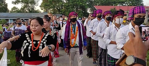 He was subsequently escorted to Singpho Cultural Heritage Centre wherein the local legislator, Mossang, his wife Krishna Mossang, Pisilu Singpho, the president of Bordumsa Mahila Mandal, Singpho chiefs, Singpho students and youths, women organizations and several others from various communities and community-based organizations accorded a red-carpet welcome to the hero marked by traditional folk dances and bursting of crackers.