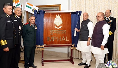 NEW DELHI: The crest of Yard 12706 (Imphal), the third amongst the four Project 15B stealth guided missile destroyers, was unveiled by Defence Minister Rajnath Singh, in the presence of Manipur Chief Minister N Biren Singh, in New Delhi on Tuesday.