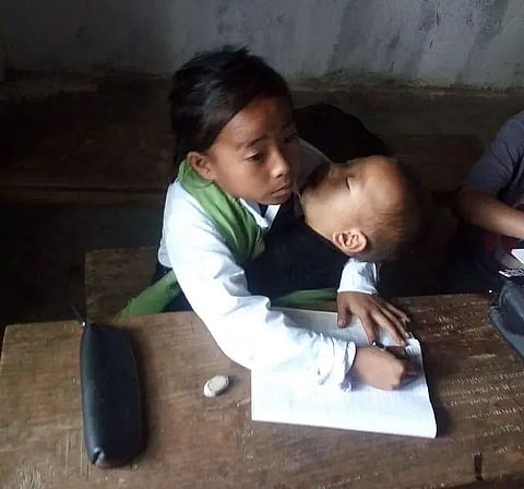 Imphal: A picture and video of a 10-year-old girl in Manipur attending school while babysitting her sister have gone viral.