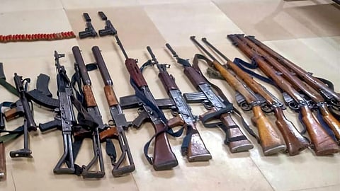 Official sources reported that the recovered items comprised a Self-Loading rifle (SLR) without a magazine, a single-barrel gun, a homemade 9mm pistol with an empty magazine, a country-made .32 pistol, and three high-explosive hand grenades without detonators.