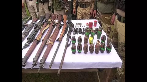 The recovered items included an AK-47, five SLR rifles, a modified .303 rifle, an Insas rifle, three .303 rifles, two sbbls, 11 HE grenades, one Chinese hand grenade, three wp gren MK Is, 15 grenade launching tubes, a small quantity of suspected pek along with fuses, six detonators, two detonator boxes, six ballistic cartridges, three empty 12-bore cases, a BP vest, two walkie-talkies (Baofeng), an empty AK-47 magazine, an empty Insas rifle magazine, four empty .303 rifle magazines, five empty SLR rifle magazines, and a locally made pipe bomb.